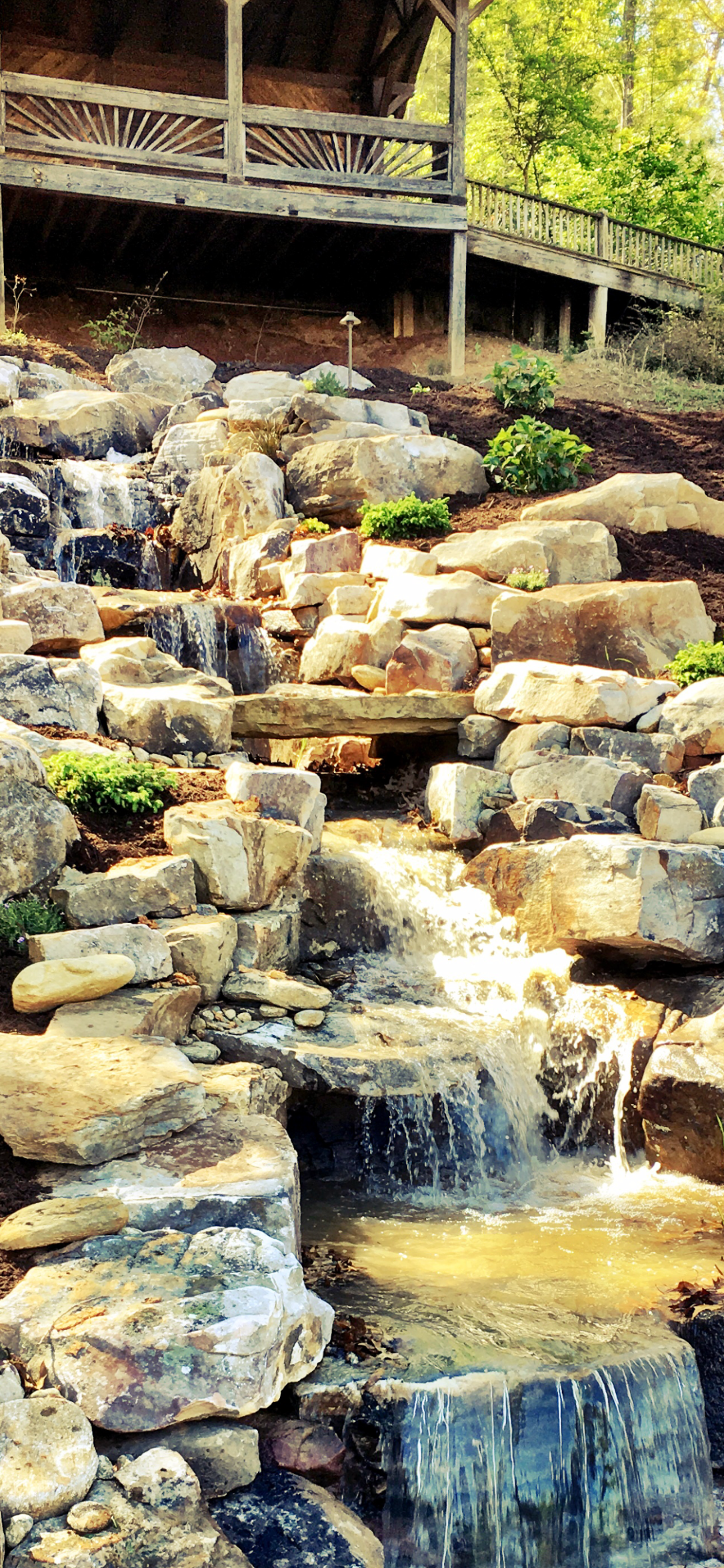 We recently finished some of the edging work on the large pondless waterfall that we built last year. This included 2 wood bridges, a stone slab bridge and 2 stepping stones that help our client and his visitors enjoy the waterfall and surrounding landscape.