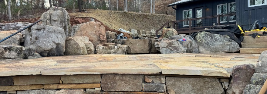 Finishing major stone placement on the patio Setting and leveling the larger structural boulders Rough-in installing the gas line for the fire pit