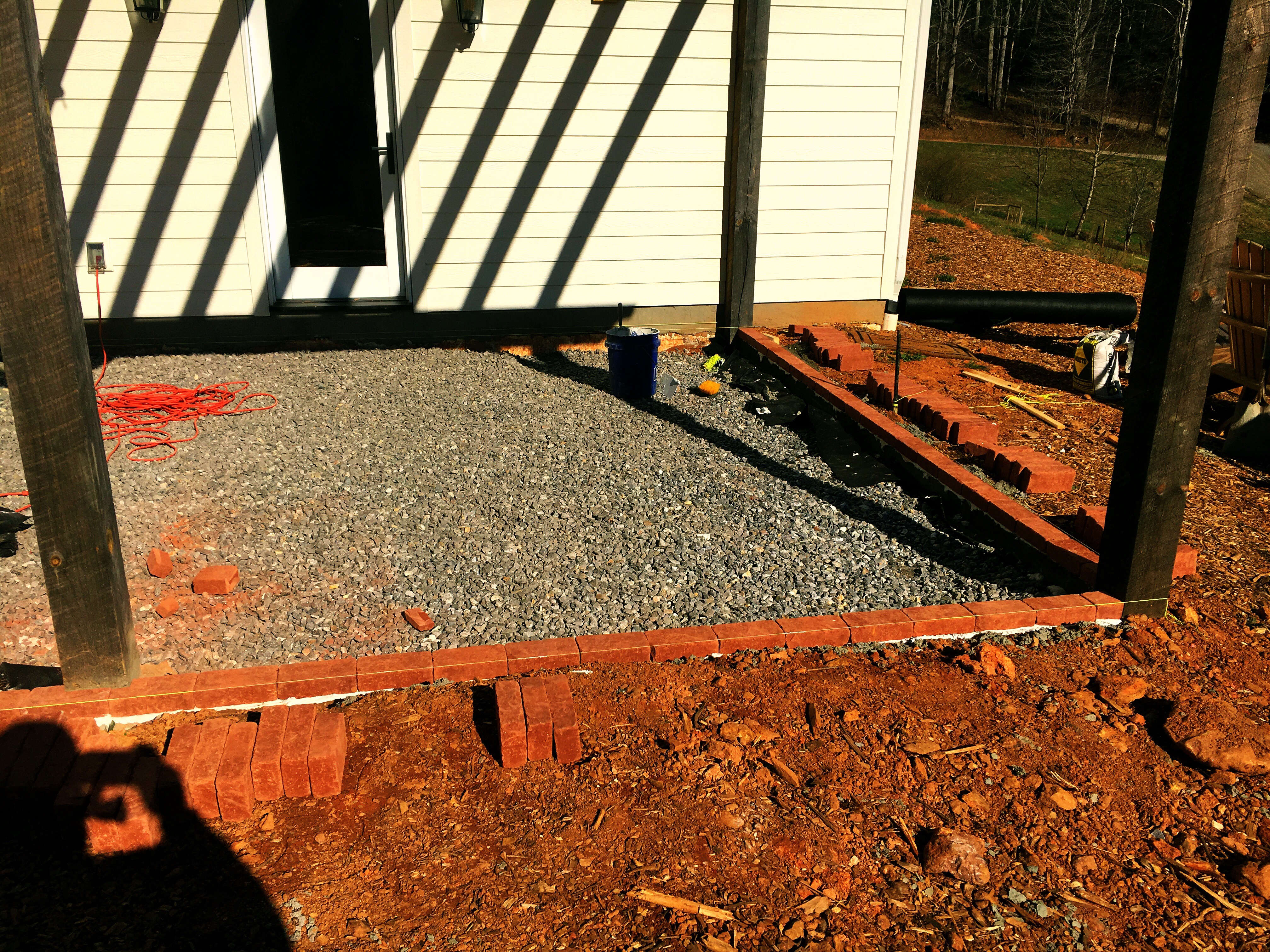 We also prepared the base material for the patio as you can see here. We use a 3/4 drain rock for the base with a screed of 3/8 crushed stone for leveling. This is not always a standard practice for ft laid patios. However, we have found it to be superior to the traditional sand and road bond installation. The gravel allows for a stronger and free draining base.